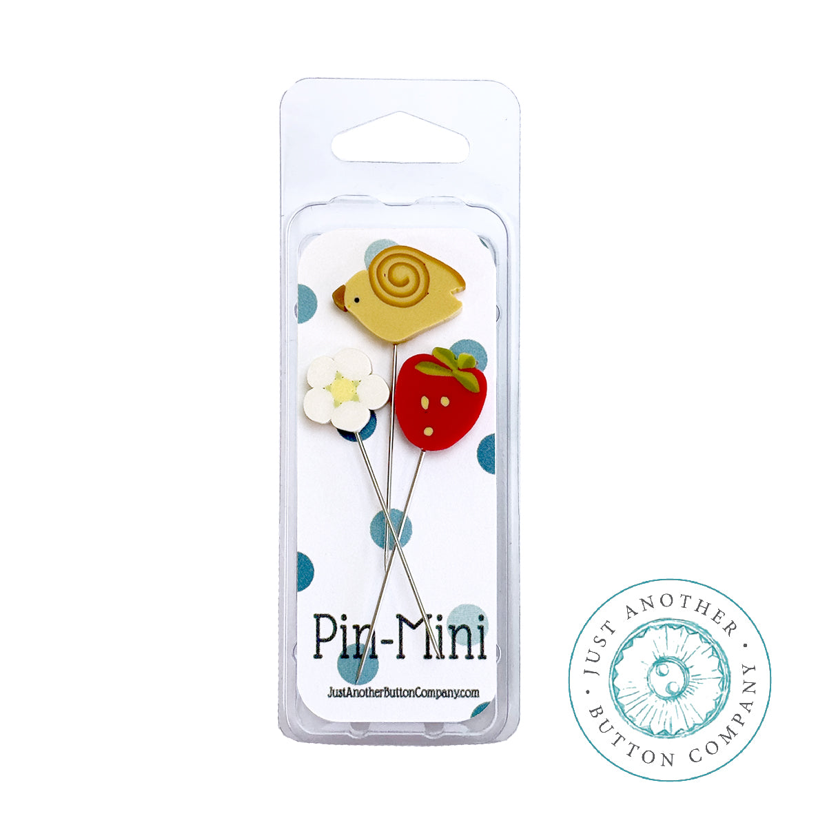 Handmade JABC button slice mounted on a stainless steel sewing pin. Assortment of three, packaged in a clam shell. Use to embellish pincushions.