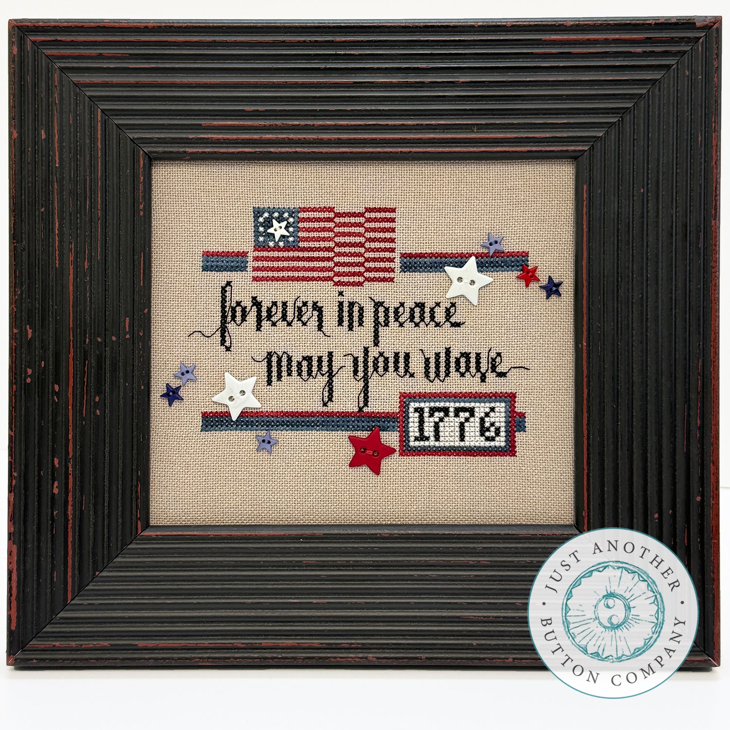 Forever in Peace is a JABC ButtonStitch Mini--sweet and simple chart for a button-sized project. Buttons (10) are included with the chart purchase. Model uses C&C Cherry Cobbler and Stargazing.